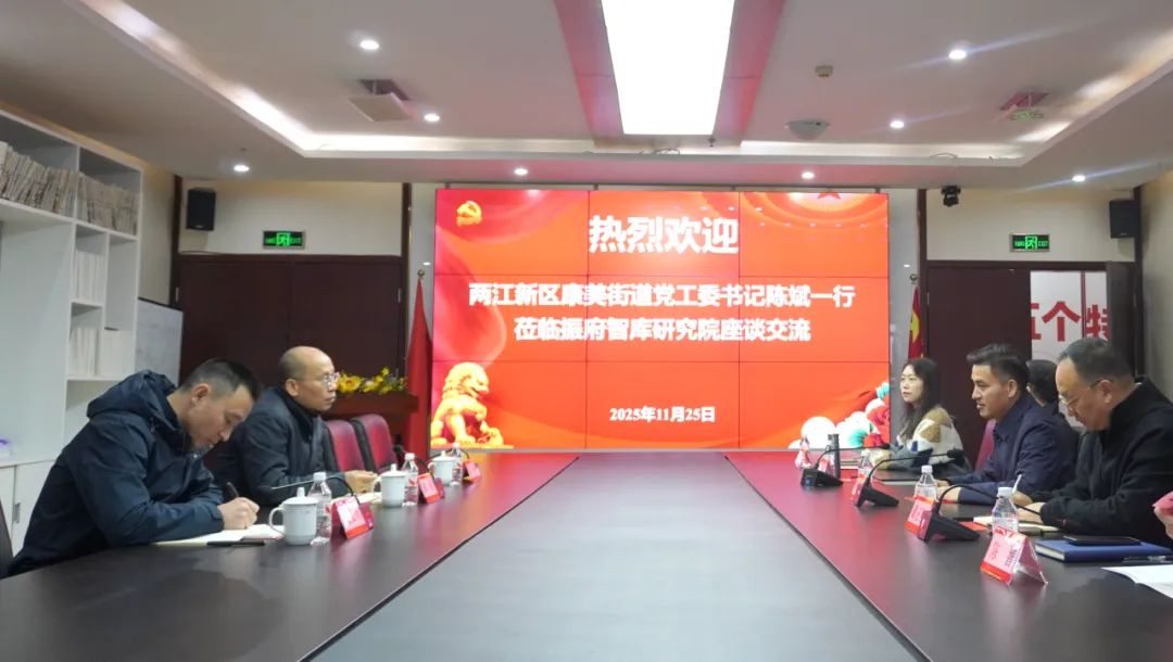 11月24日,重庆两江新区康美街道党工委书记陈斌一行,莅临辖区内的振府智库开展调研座谈。振府智库研究院院长谭修刚、重庆研究院副院长戴正权及专家何平、陈智参会,双方围绕 “推进镇道经济、建设新型智库平台” 深度磋商。